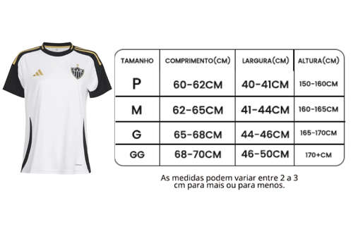 O design apresenta predominância branca com detalhes dourados, gola careca e escudo bordado, oferecendo sofisticação e identidade com o Atlético Mineiro.
