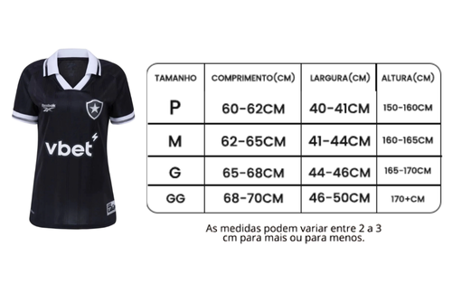 A Camisa Botafogo II 25/26 Torcedora Reebok Feminina apresenta a versão alternativa em preto com detalhes brancos. Com modelagem ajustada e tecido leve, garante conforto, estilo e respirabilidade para torcer, treinar ou usar no dia a dia.
