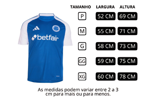 O escudo do Cruzeiro Esporte Clube é bordado em alto relevo, assim como o logo Adidas, garantindo acabamento refinado e durabilidade. Um manto que une tradição, estilo e performance.