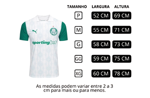 O design na cor branca, com detalhes em verde, traz o escudo bordado no peito e acabamento premium, representando a tradição e a força do Palmeiras.