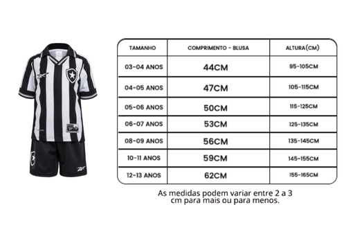 O Kit Infantil Botafogo I 25/26 é o presente ideal para os pequenos torcedores! Composto por camisa e short, o conjunto traz o design listrado em preto e branco, com tecido leve e resistente para brincadeiras, treinos e dias de jogo.