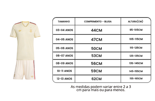O Kit Infantil Flamengo III 25/26 apresenta a versão alternativa em off white e detalhes dourados para as crianças que querem um look diferenciado ao torcer pelo Mengão.