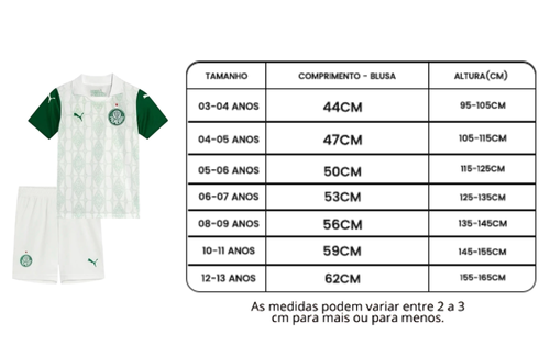 O kit inclui camisa e short na cor branca, com detalhes verdes, escudo bordado e acabamento premium.